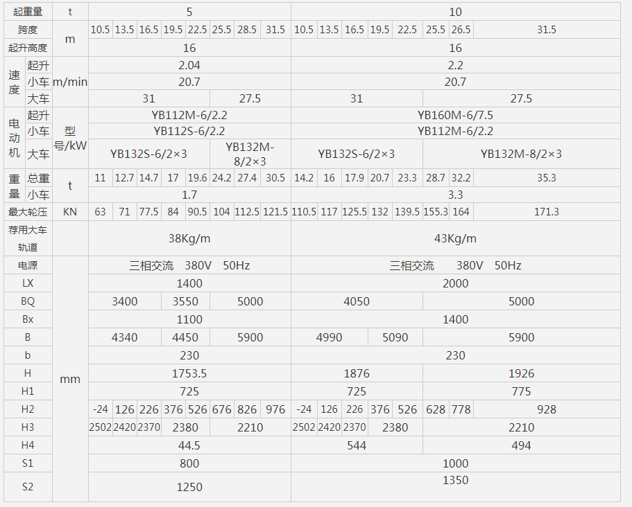 本产品广泛适用于普通重物的装卸与搬运,还可配以多种专用吊具进行特殊作业,当露天使用时带有防雨设备。表中数据为室内起重机用,室外起重机总重和轮压约增加5%,起重机按使用繁忙程度分为中级(A5)和重级(A6)两种工作制度。选用时应注明工作制度,工作环境的最高、最低气温及电源种类等技术要求,还可根据用户要求的跨度设计制造。